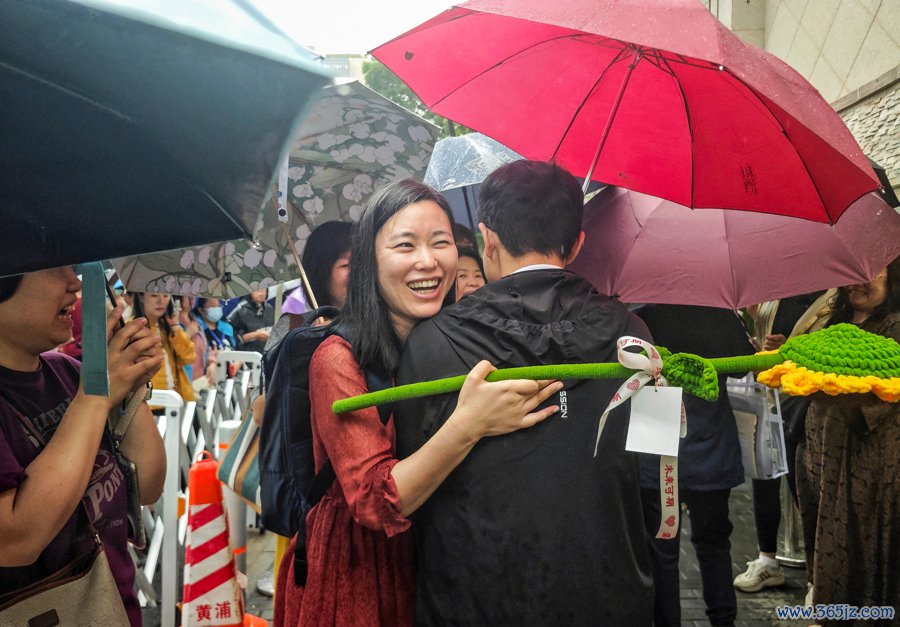 2025年6月7日高考首日恰逢梅雨天。在黄浦区上外洋国语大学附庸大境中学考点,五爱中学淳厚冒雨在校门口送考,并为考生奉上祝福。